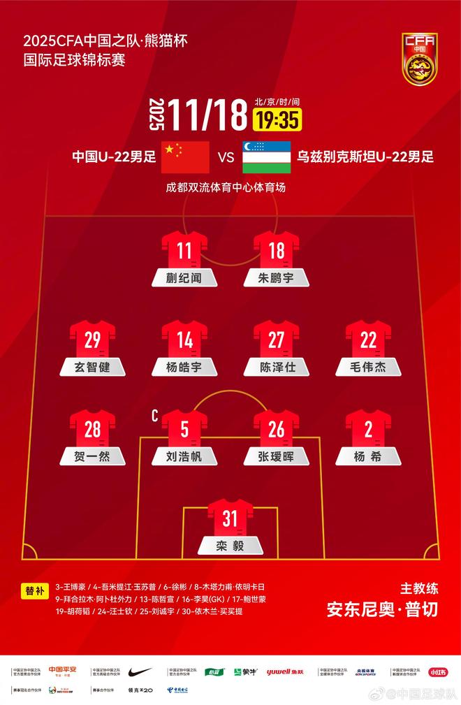 11月18日晚,中国足协2025年熊猫杯国际足球锦标赛第三轮比赛中,中国U22队继续坐镇成都双流体育中心体育场,对阵乌兹别克斯坦U22队。赛前双方均公布了首发阵容。经过主帅安东尼奥·普切调整的U-22队首发十一人,较上一场U-22对阵韩国队的比赛,包括门将在内的九个位置进行了大幅调整,只剩下刘浩芳和何一兰。其中,刘浩芳继续担任队长,阮毅出任门将,何以兰、张爱辉、杨曦、刘浩芳组成后防线。陈则石、杨浩宇、毛伟杰、宣志坚组成中场。前线,蒯志文与朱鹏宇结为搭档,奋勇前进。可以看到,从第十五届全国锦标赛归来的蒯志文、朱鹏宇、毛伟杰,开始包括休息后进入首发十一人。替补席上,王博豪、尤米特吉安·尤斯普、舒斌、穆塔利夫·伊明卡利、拜拉姆·阿卜杜勒瓦利、陈泽焕、李浩、包西门、胡鹤涛、王士钦、刘成宇、耶姆兰·麦买提始终待命。在当天的另一场比赛中,韩国U-22队以1-0击败越南U-22队,暂时领先6分。如果U22国足能够击败乌兹别克斯坦U22国家队,他们将击败韩国U22国家队,以胜负优势夺得冠军。如果U22国足与乌兹别克斯坦队打平,则以净胜球优势获得第二名,韩国U22队将获得冠军。如果U22国足输给乌兹别克斯坦U22,则积分榜垫底。