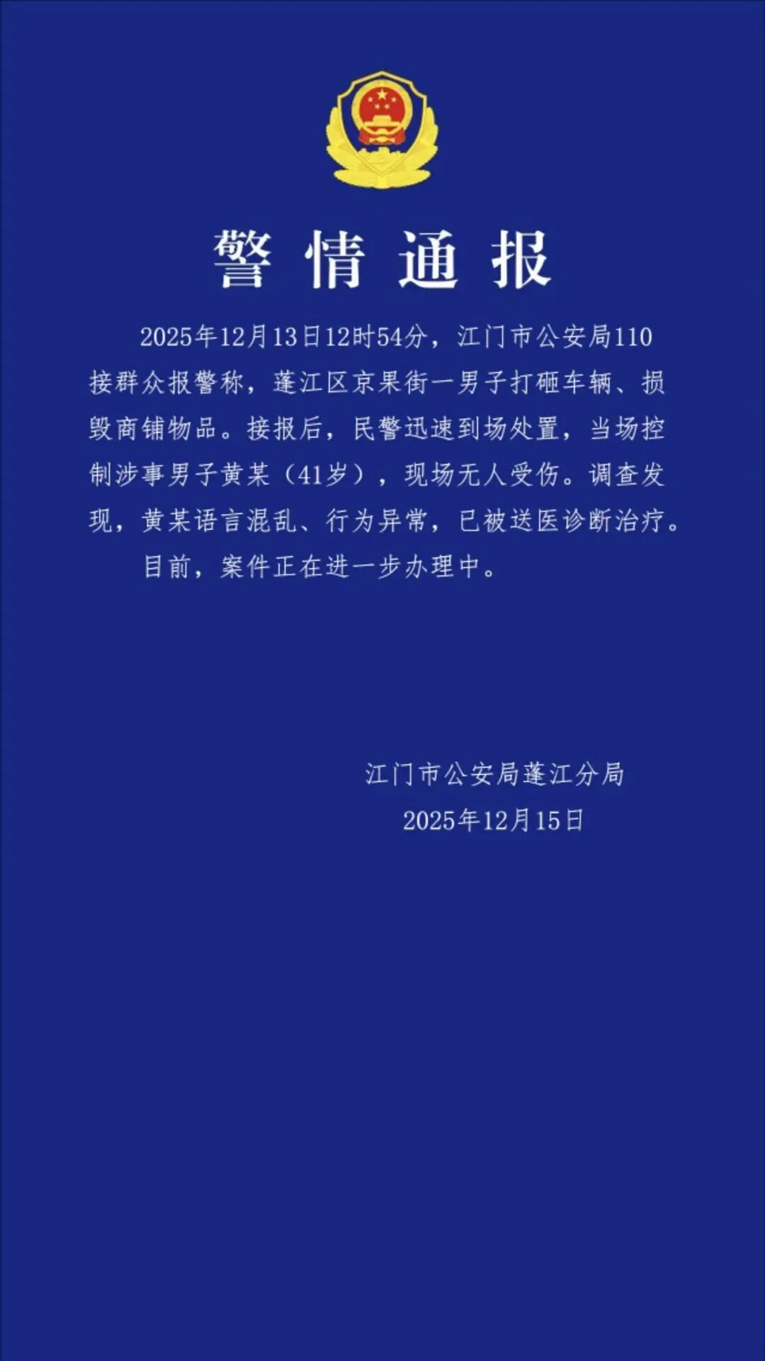 广东省江门市公安局蓬江分局12月15日通报:2025年12月13日12时54分,江门市公安局110接到群众电话称,蓬江区景国街一男子闯入汽车,损坏店铺商品。接报后,警方迅速赶到现场,将涉案男子黄某(41岁)在现场控制。现场没有人受伤。经调查发现,黄某言语不清,行为异常,被送往医院诊治。目前,案件仍在审理中。
