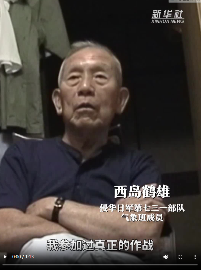 在第12个南京大屠杀死难者国家公祭日之际,侵华日军第731部队(简称731部队)罪证陈列馆发布了一段38分钟的视频证词。 731部队气象队队员西岛鹤夫证实,他亲自参与了日军在浙江、江西发动的细菌战,并描述了实施细菌战的过程。记者:杨思奇,他制作了新华社音像部出品的《山》